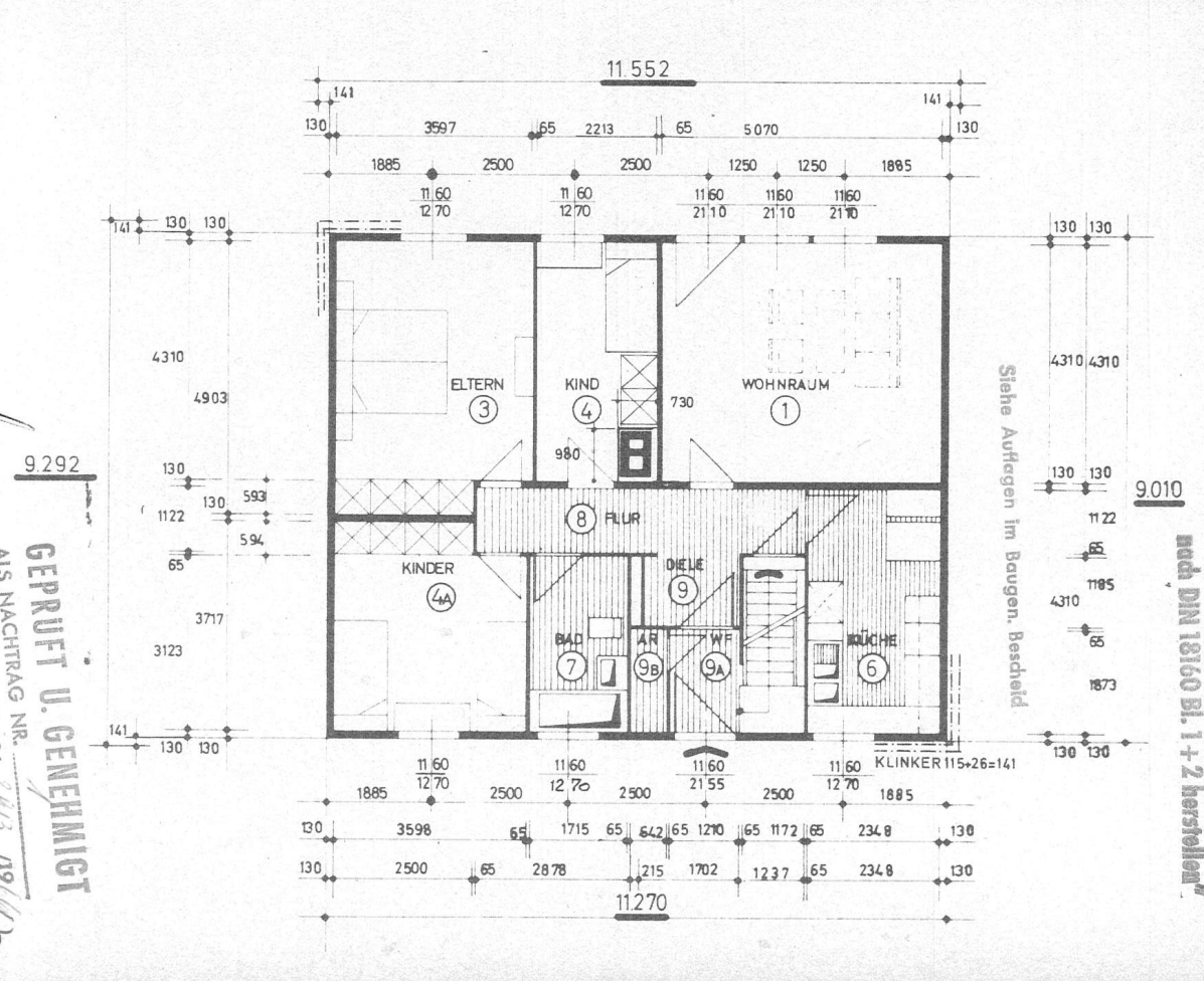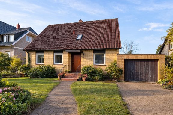 Auf dem Grundstück steht derzeit ein freistehendes Einfamilienhaus (OKAL-Fertighaus, Baujahr 1967) inkl. Einliegerwohnung in vorgeklinkerter Holzständerbauweise. Das Haus ist voll unterkellert, der Keller verfügt über einen separaten Außenzugang. Eine angebaute Garage mit direktem Zugang zum Garten ist ebenfalls vorhanden.