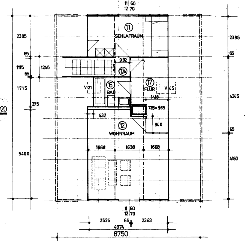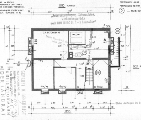 Die derzeitige Raumaufteilung umfasst im Erdgeschoss 3,5 Zimmer, ein Vollbad, ein Gäste-WC und eine Küche. Das Ende der 1970er Jahre ausgebaute Obergeschoss bietet eine kleine 2-Zimmer Einliegerwohnung mit zwei Zimmern, Bad und Pantry.